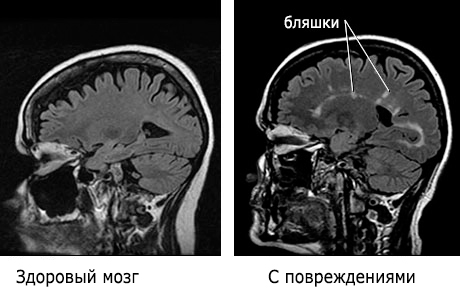 МРТ головного мозга при рассеянном склерозе. Выявляются множественные разнообразных размеров и форм очаги в белом веществе полушарий головного мозга.