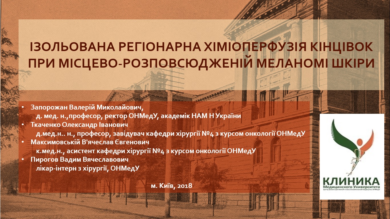 Актуальні питання дерматоонкологіїМеланома шкіри, незважаючи на значний прогрес в онкології, лишається однією з невирішених проблем сучасної медицини. 18-19 травня у м.Київ відбулась науково-практична конференція "Актуальні питання дерматоонкології" з міжнародною участю, зокрема спеціалістів з Німеччини, Італії. Завідувач операційним відділенням, онкохірург Максимовський В'ячеслав Євгенійович приймав участь в якості модератора секційного засідання, та доповів про сучасні можливості лікування місцево-розповсюдженої меланоми кінцівок, зокрема про ізольовану регіонарну хіміоперфузію кінцівок (ILP), поділився досвідом Університетської клініки. Нагадаємо, що з 2016 року завдяки зусиллям ректора ОНМедУ Запорожана Валерія Миколайовича, завідуючого кафедрою онкології Ткаченко Олександра Івановича, директора клініки Муратової Тетяни Миколаївни, Університетська клініка отримала можливість проводити високотехнологічну операцію, що стала альтернативою ампутації кінцівок для хворих з занедбаними стадіями меланоми. Це було б неможливо без допомоги завідуючого відділенням Осадчого Д.М., справжніх друзів нашого відділення Московченко В.В., Umberto Carletti, судинних хірургів Чехлова М.В., Рябоконя А.М., анестезіологів Дузенко О.О., Босенко К.В., та багатьох інших співробітників клініки.